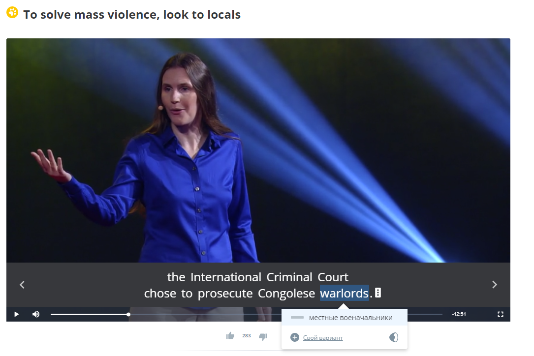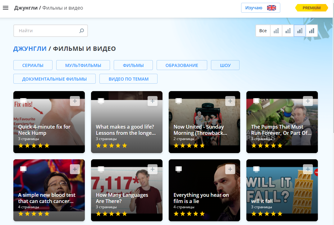 В приложении собран контент с других ресурсов, но в нем к видео, например, прилагается полный текст - в котором можно кликать на слова и узнавать их значения в реальном времени, при просмотре. И добавлять их в словарь для дальнейшего изучения.