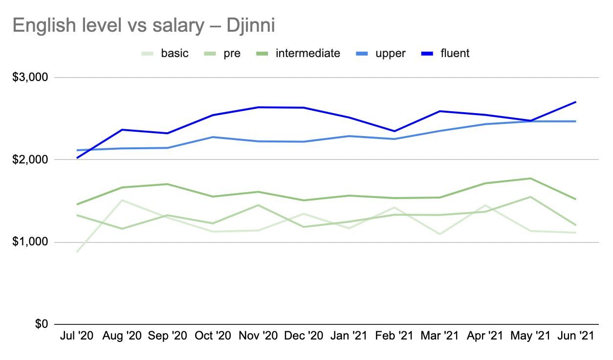 Уровень английского в IT часто влияет на уровень заработной платы - те же Бизнес Аналитики получают больше, если уровень английского лучше, как мы видели по графикам в статье. Усредненная статистика по всем ИТ-предложениям (не только БА):